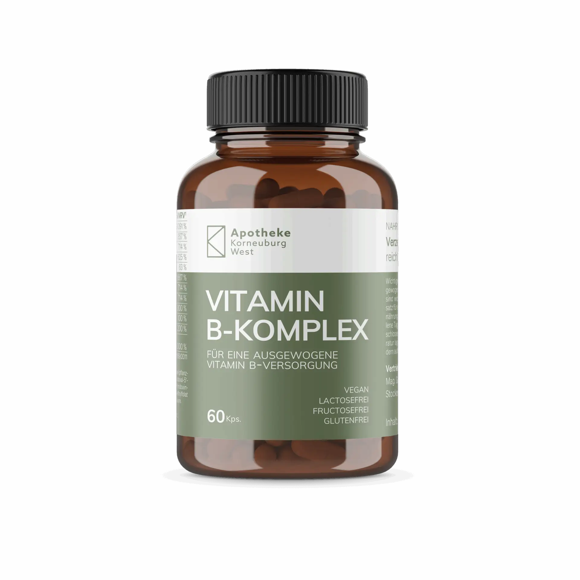 Zutaten: CalciumDpantothenat, Hydroxypropylmethylcellulose (pflanzliche Kapselhülle), Thiaminhydrochlorid, Nicotinamid, Pyridoxal5‘phosphat (P5P), Riboflavin5‘phosphat-Natrium (R5P), Pyridoxinhydrochlorid, Inositolhexanicotinat, Riboflavin, CalciumLmethylfolat (5MTHF), DBiotin, Methylcobalamin, Pteroylmonoglutaminsäure.